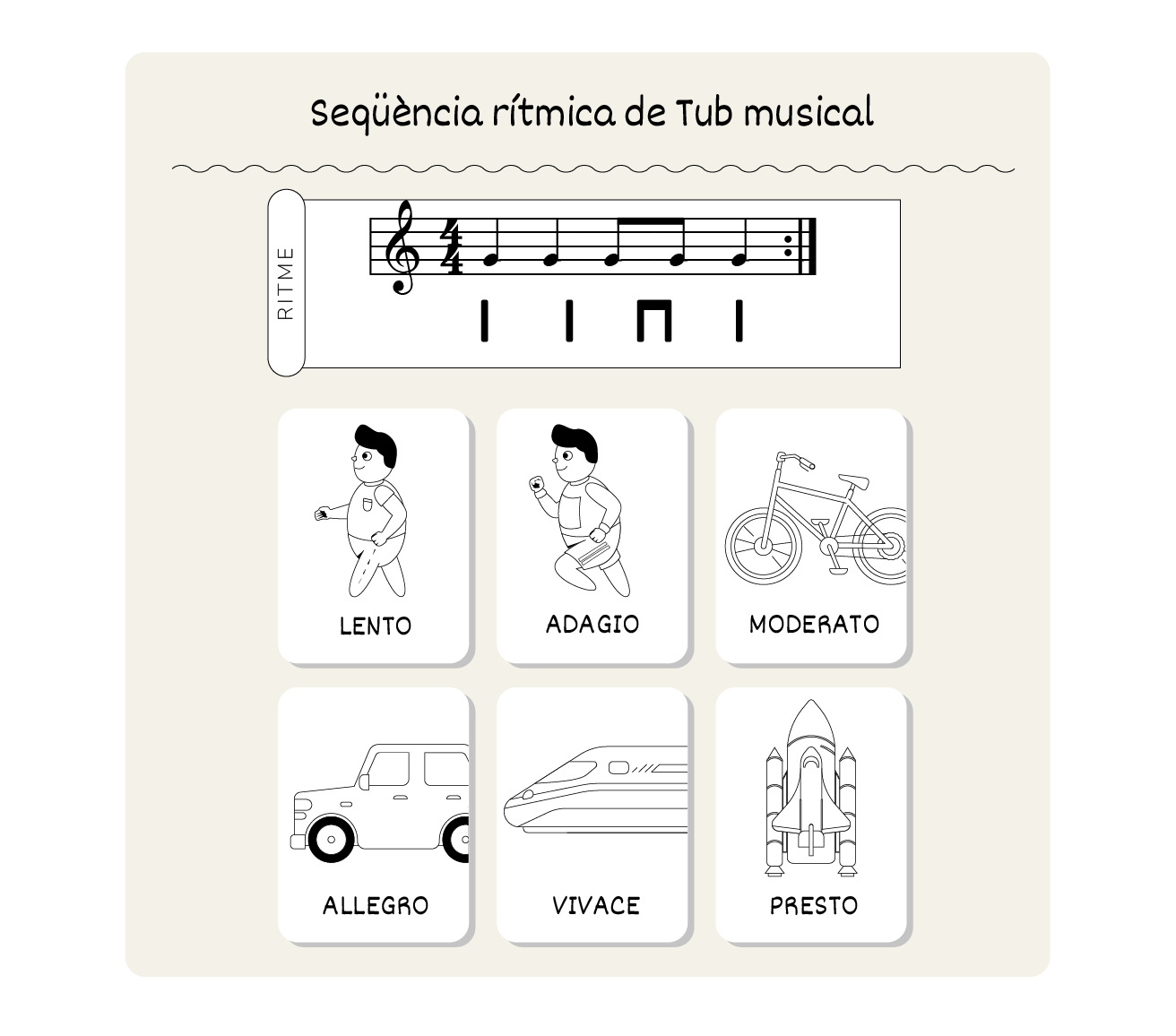 "La música pot tenir molts tempos o velocitats diferents. A la vostra fitxa, en trobareu 6. Retalleu les imatges i enganxeu-les al lloc correcte, començant per la més lenta."