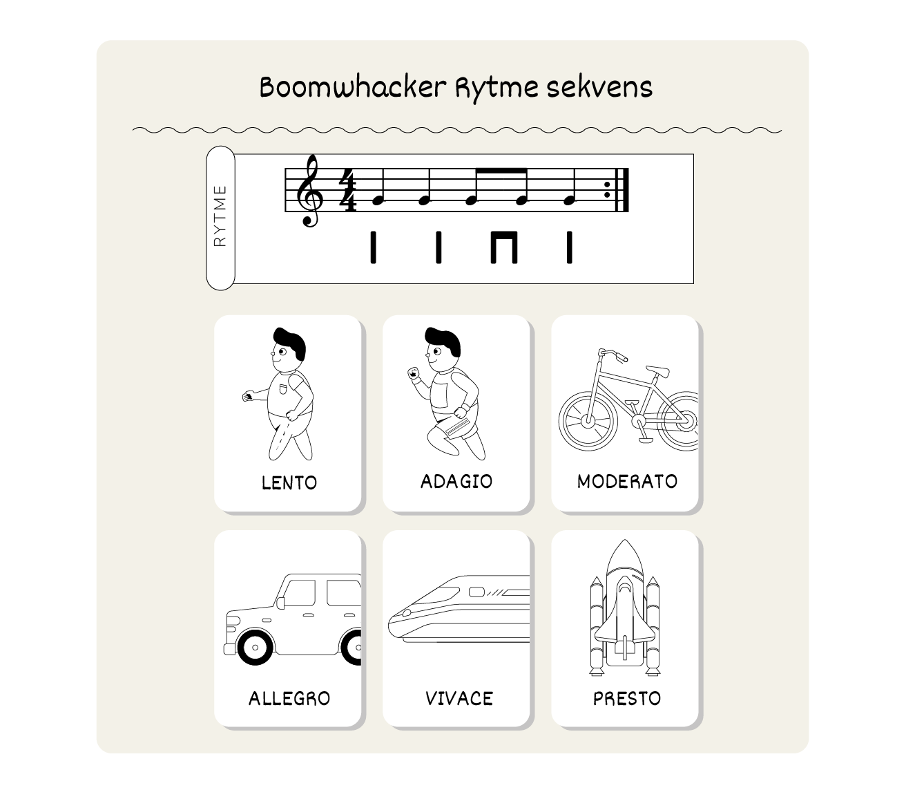 "Der kan være mange forskellige tempi eller hastigheder i musikken. På dit arbejdsark finder du 6 af dem. Klip billederne ud og sæt dem på det rigtige sted, start med det langsomste."