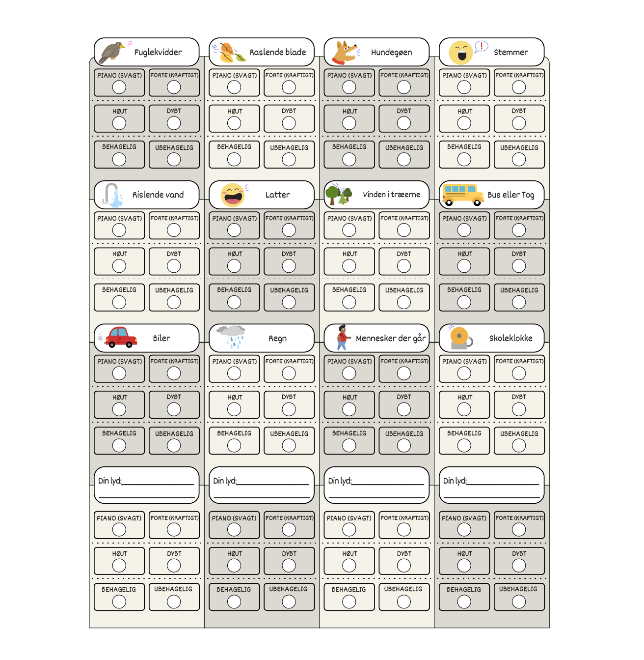 Find også selv fire lyde og tilføj på arket."