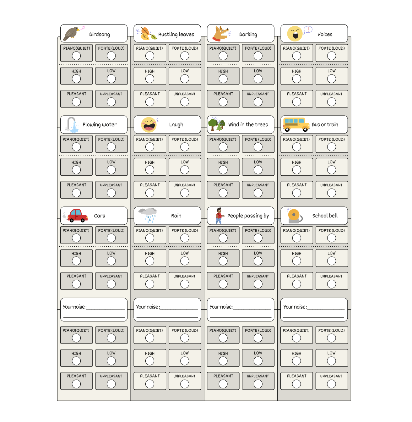 “We’re going to go outside on a soundwalk. As you walk around, try to be very quiet and listen carefully. The aim of the walk is to discover as many sounds from your surroundings as possible. Use your sound grid to mark the sounds you hear and indicate whether they are 1) high or low 2) loud or quiet 3) pleasant or unpleasant. If you hear sounds that aren't already listed on your sound grid, you can add them on there."