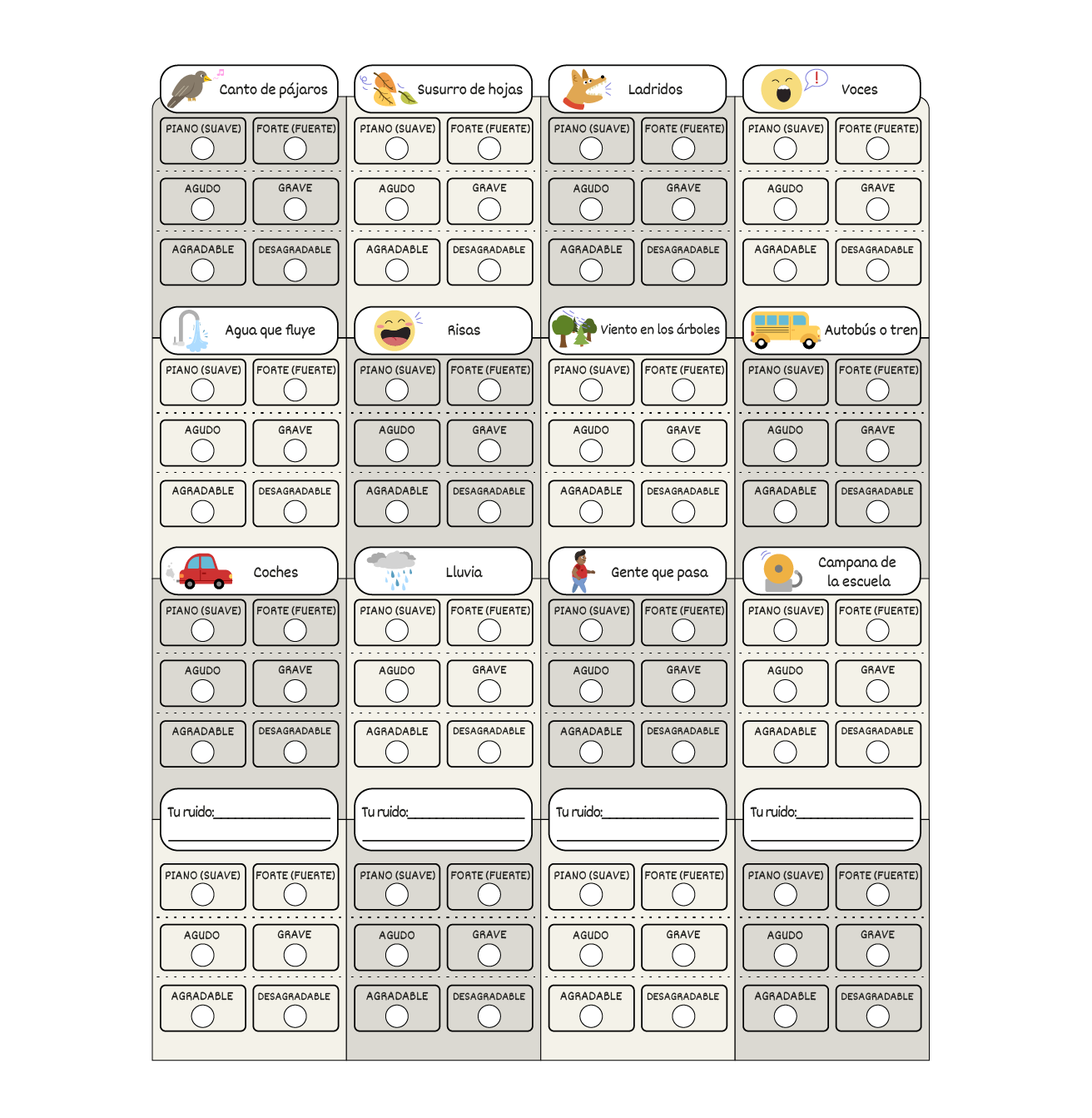 “Vamos a salir ahora y dar un paseo sonoro. Trata de estar muy silencioso y escuchar tantos ruidos de su entorno como sea posible. Marca los sonidos que escuches en una cuadrícula de sonido y marque si los sonidos son 1) agudos o graves 2) fuertes o suaves 3) agradables o desagradables.