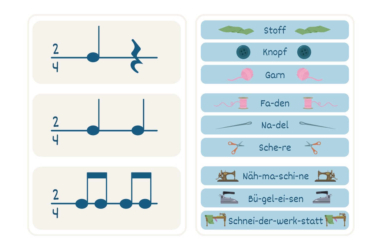 ... sammeln Begriffe aus dem thematischen Feld „Schneiderwerkstatt“ und verarbeiten diese rhythmisch und klanglich weiter.