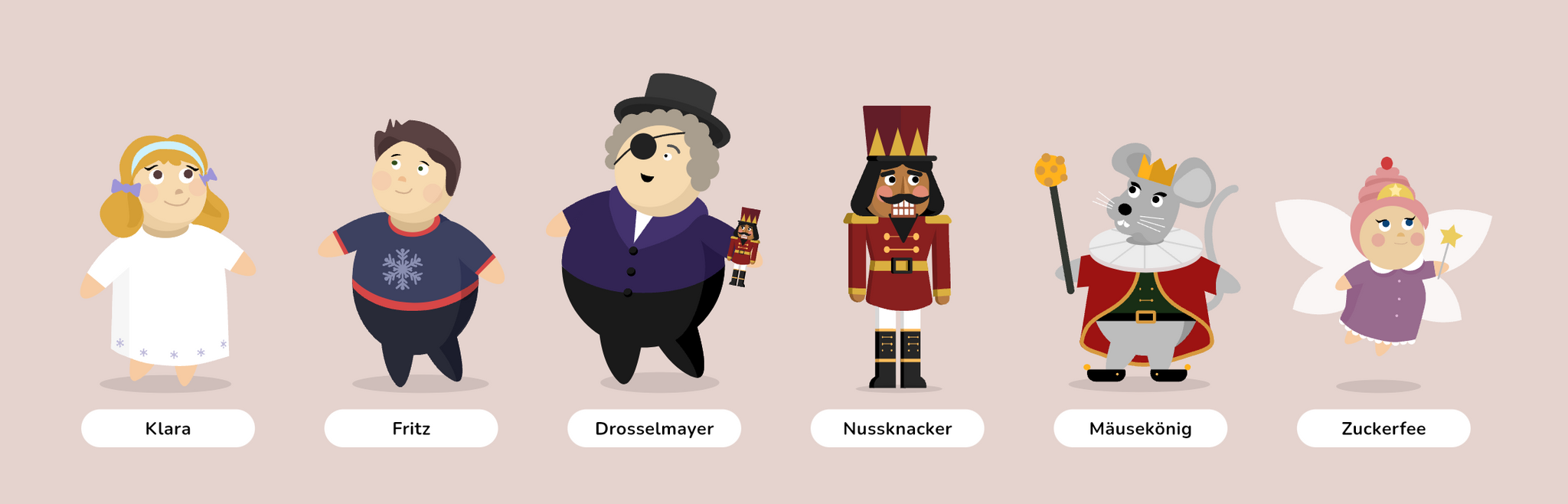„1. Wir lernen heute die Charaktere der Geschichte etwas besser kennen. Suche dir dafür eine Figur aus der Geschichte aus, die du sein möchtest (Nussknacker, Mäusekönig, Zuckerfee, Klara, Fritz oder Onkel Drosselmeyer).