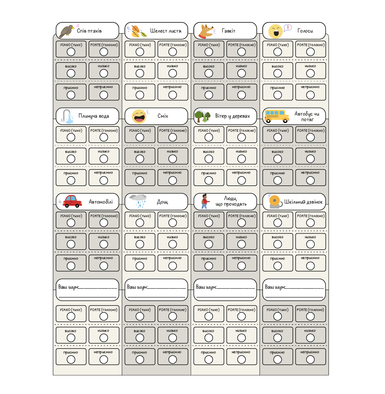 «Зараз ми вийдемо на вулицю і погуляємо. Намагайтеся бути дуже тихими і сприймати якомога більше звуків, що вас оточують. Позначте звуки, які ви чуєте, на звуковій сітці та позначте, чи ті звуки